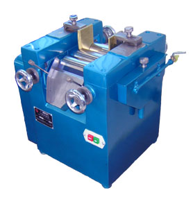 該設(shè)備由三個(gè)輥筒組成,裝在一個(gè)機(jī)架上,由電機(jī)直接帶動(dòng)。一般輥筒間的轉(zhuǎn)動(dòng)方向不同,前輥向前轉(zhuǎn)動(dòng),中輥向后轉(zhuǎn)動(dòng)。輥?zhàn)愚D(zhuǎn)速前輥快、后輥慢。中間輥固定,前后兩輥裝在滑道上,有彈簧裝置,用手輪調(diào)節(jié)前后輥與中輥的距離。物料由后輥與中輥之間進(jìn)入,受到輥筒的擠壓,產(chǎn)品顆粒變細(xì),然后由快輥帶出,快輥末端裝有刮刀,使物料與輥筒分離,落入收集桶內(nèi)。由于研磨過(guò)程產(chǎn)生大量熱量,各輥筒的中心是設(shè)計(jì)為空心結(jié)構(gòu),通水冷卻,保證產(chǎn)品質(zhì)量。